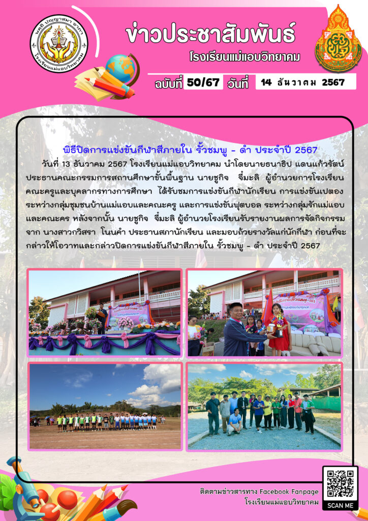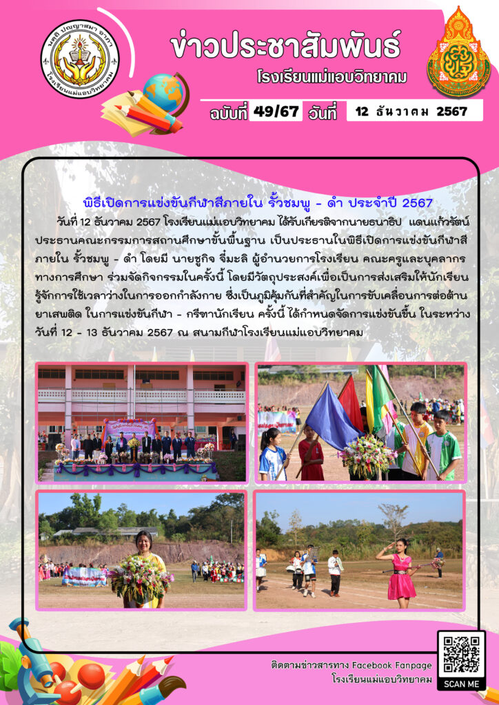 • ภาพบรรยากาศกีฬาสีภายใน โรงเรียนแม่แอบวิทยาคม ปีการศึกษา 2567 →