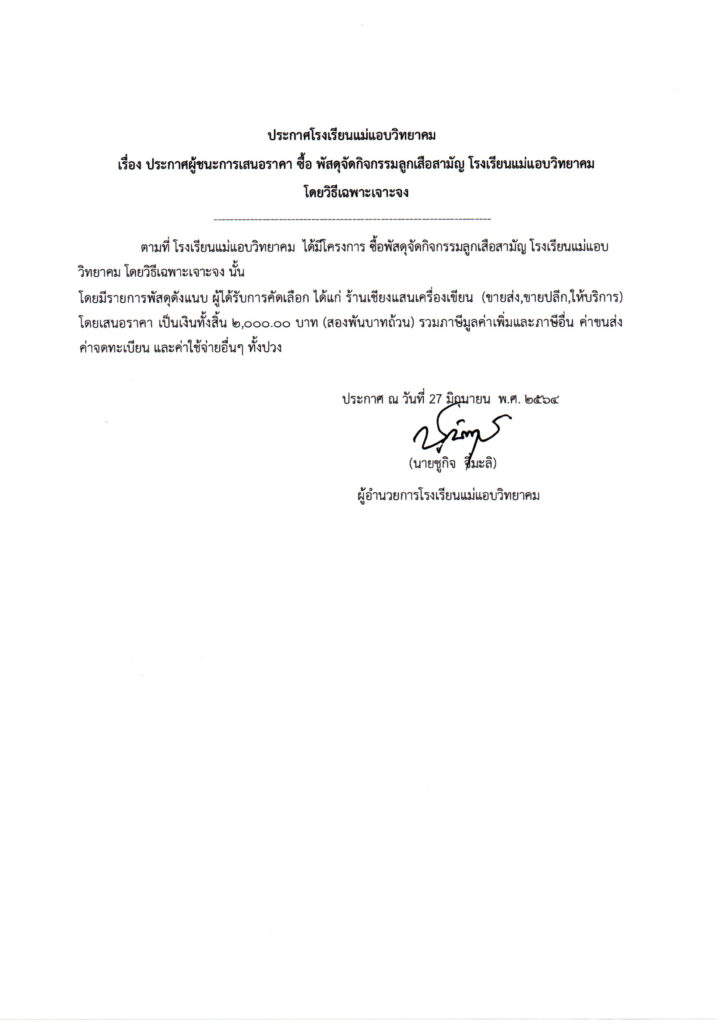 จัดซื้อ / จัดจ้าง ประกาศผู้ชนะการเสนอราคาซื้อพัสดุ กิจกรรมลูกเสือสามัญ 27 มิถุนายน 20221 กันยายน 2022 Maeaeb Wit ประกาศผู้ชนะการเสนอราคาซื้อพัสดุ กิจกรรมลูกเสือสามัญ