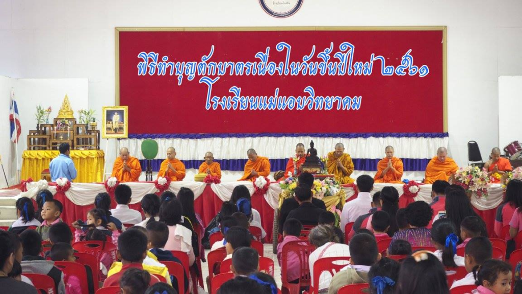 วันพฤหัสบดีที่ ๔ มกราคม ๒๕๖๑ ผอ.ชูกิจ จี๋มะลิ ผู้อำนวยการโรงเรียนแม่แอบวิทยาคม คณะครู นักเรียน และผู้ปกครอง ร่วมทำบุญตักบาตรฯ พระภิกษุสงฆ์ จำนวน ๙ รูป เนื่องในศุภวาระดิถี ขึ้นปีใหม่ ปี พ.ศ.๒๕๖๑ เพื่อความเป็นสิริมงคล ณ อาคารอเนกประสงค์ โรงเรียนแม่แอบวิทยาคม
