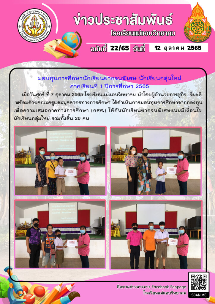 ประชาสัมพันธ์ มอบทุนการศึกษานักเรียนยากจนพิเศษ รอบใหม่ ภาคเรียนที่ 1 ประจำปีการศึกษา 2565 12 ตุลาคม 202212 ตุลาคม 2022 Maeaeb Wit รูปภาพเพิ่มเติม >> https://www.facebook.com/media/set/?vanity=maeaeb.school…