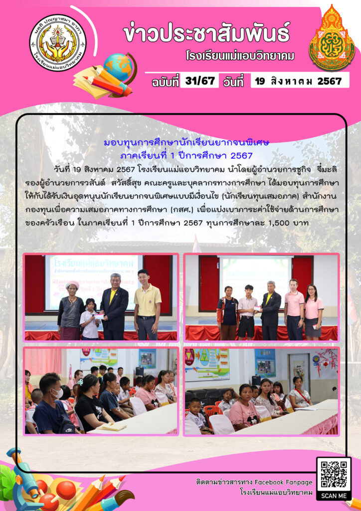 มอบทุนการศึกษานักเรียนยากจนพิเศษ ภาคเรียนที่ 1 ปีการศึกษา 2567