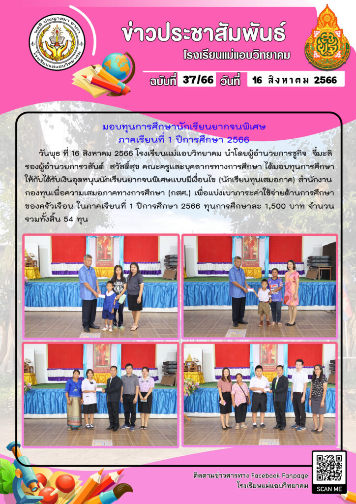 มอบทุนการศึกษาให้กับนักเรียนที่ได้รับเงินอุดหนุนนักเรียนยากจนพิเศษแบบมีเงื่อนไข (นักเรียนทุนเสมอภาค)