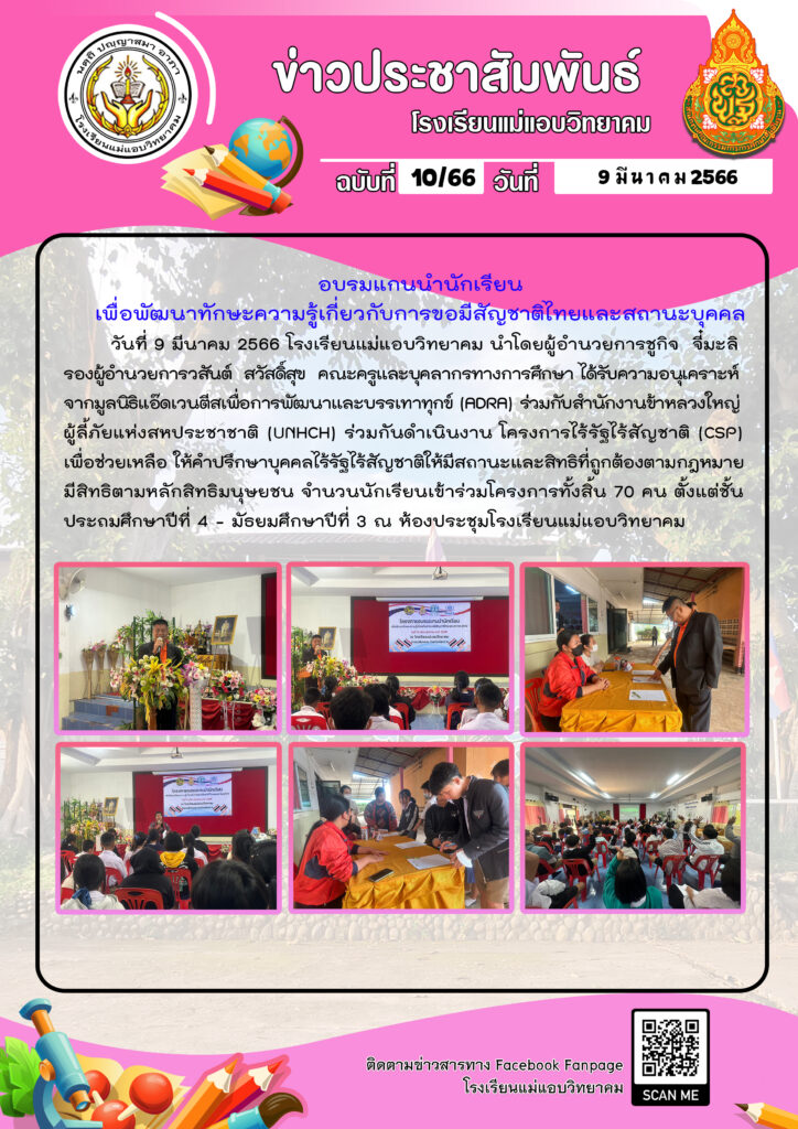 อบรมแกนนำนักเรียนเพื่อพัฒนาทักษะความรู้เกี่ยวกับการขอมีสัญชาติไทยและสถานะบุคคล