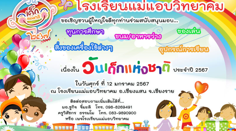 โรงเรียนแม่แอบวิทยาคม ขอเชิญชวนผู้ใหญ่ใจดีทุกท่านร่วมสนับสนุนมอบของขวัญเนื่องในวันเด็กแห่งชาติ ประจำปี 2567
